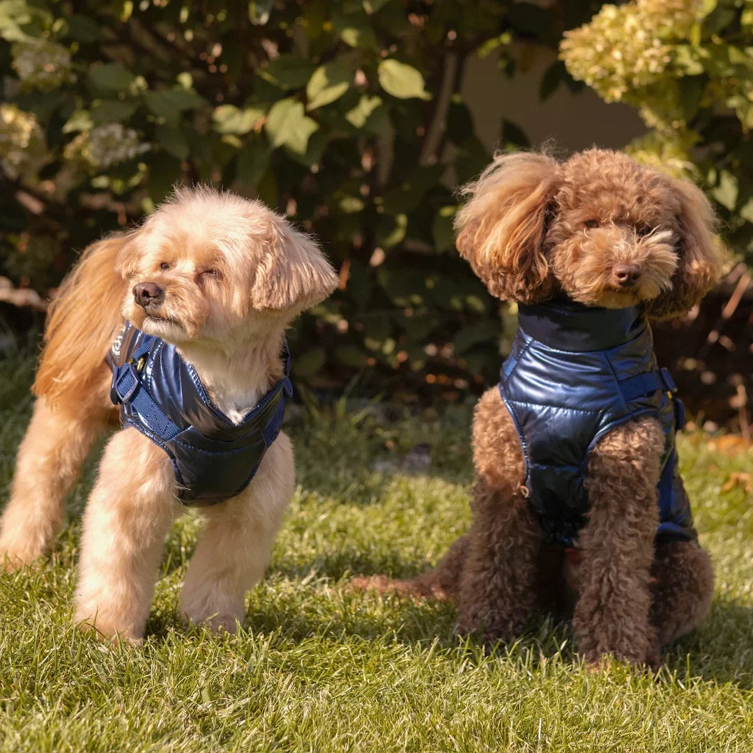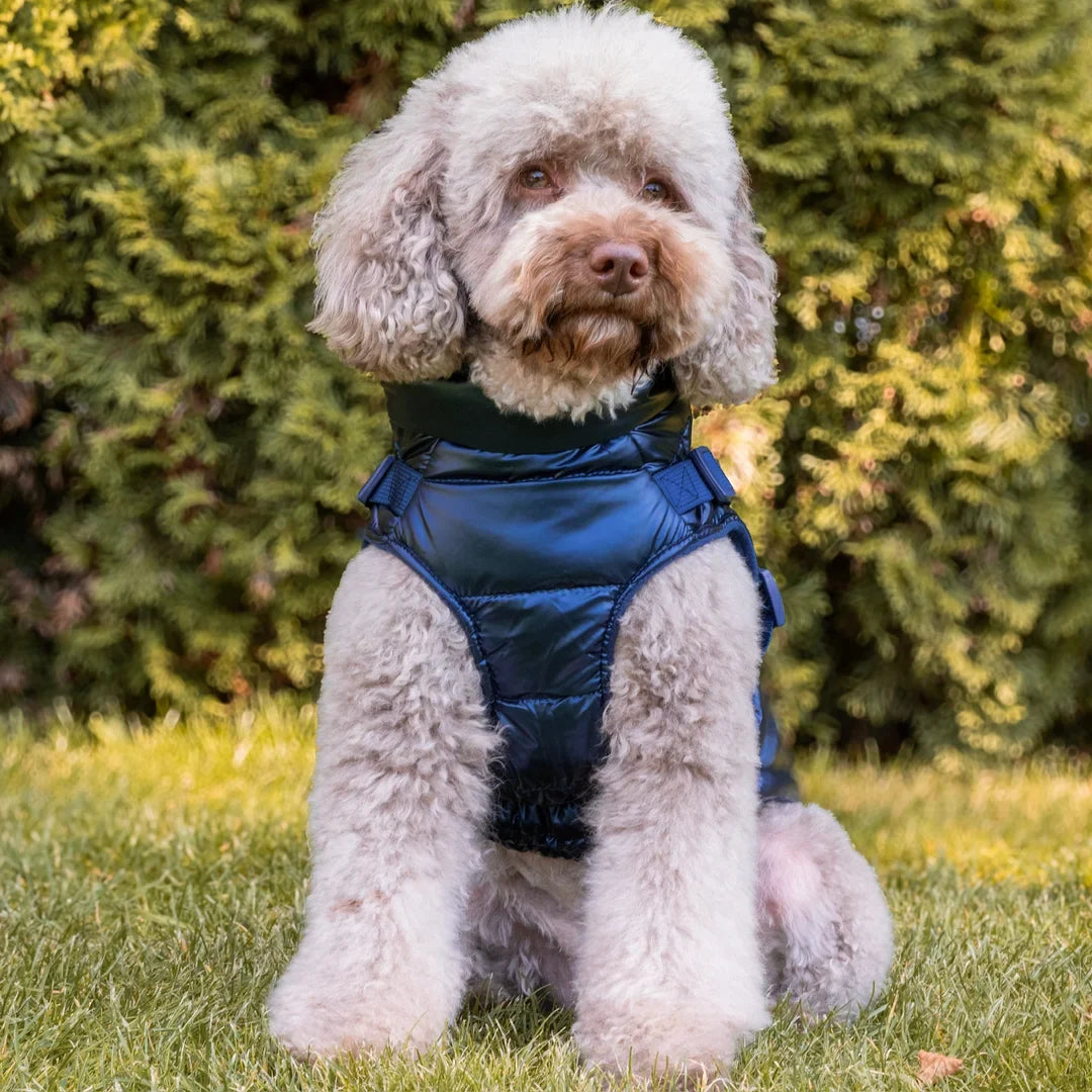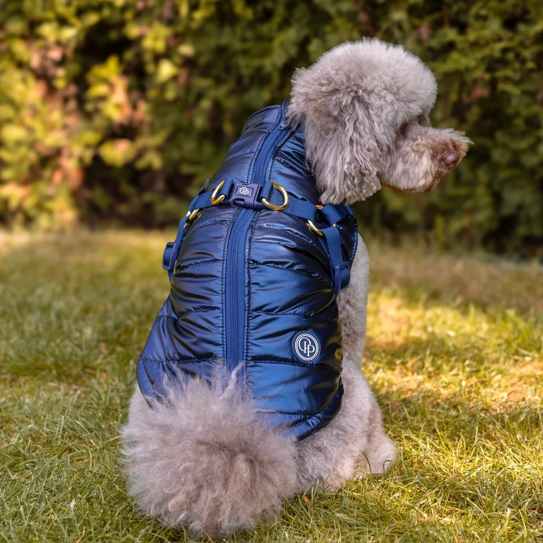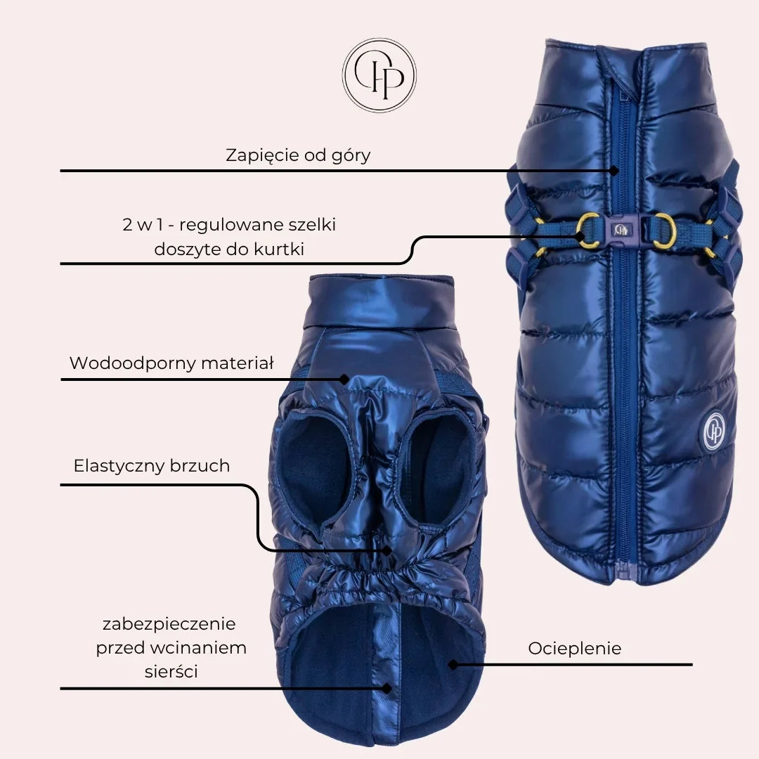 Styl i elegancja w jednym. Zimowa kurtka Pupparisian w odcieniu granatu z delikatnym połyskiem została zaprojektowana, aby zapewnić Twojemu psu komfort i ochronę w zimowe dni. To model 2w1 – kurtka z wbudowanymi szelkami, który łączy funkcjonalność i wygodę, eliminując potrzebę zakładania dodatkowych akcesoriów przed spacerem.