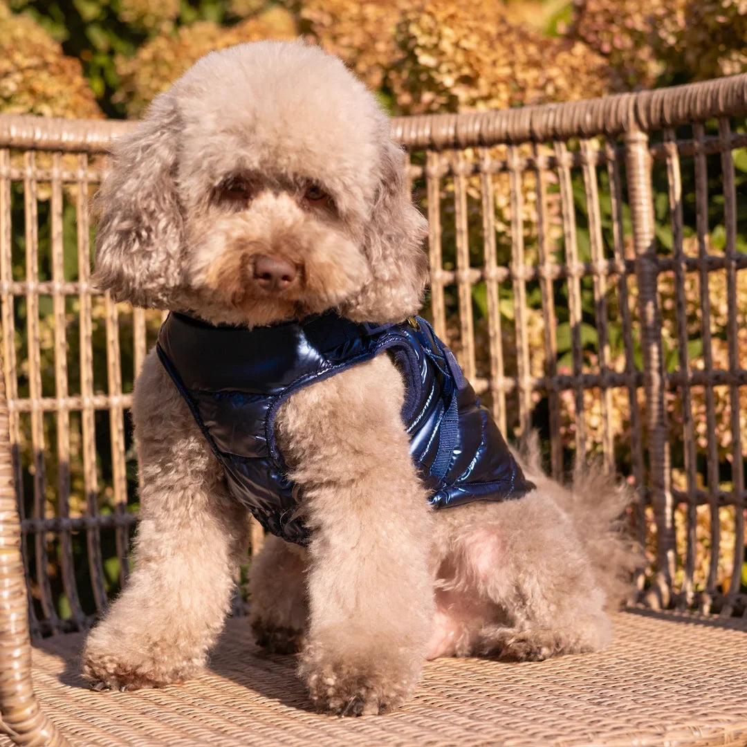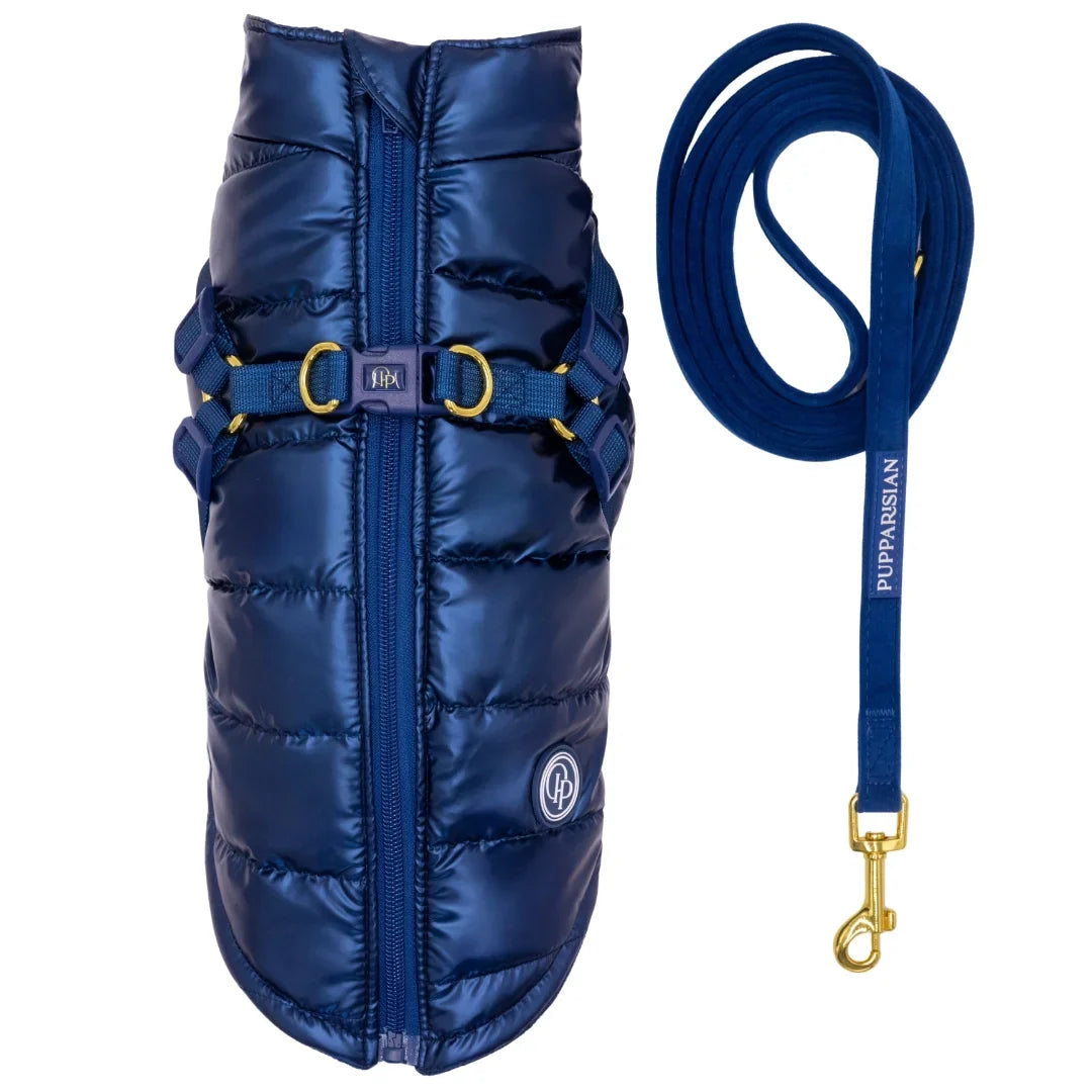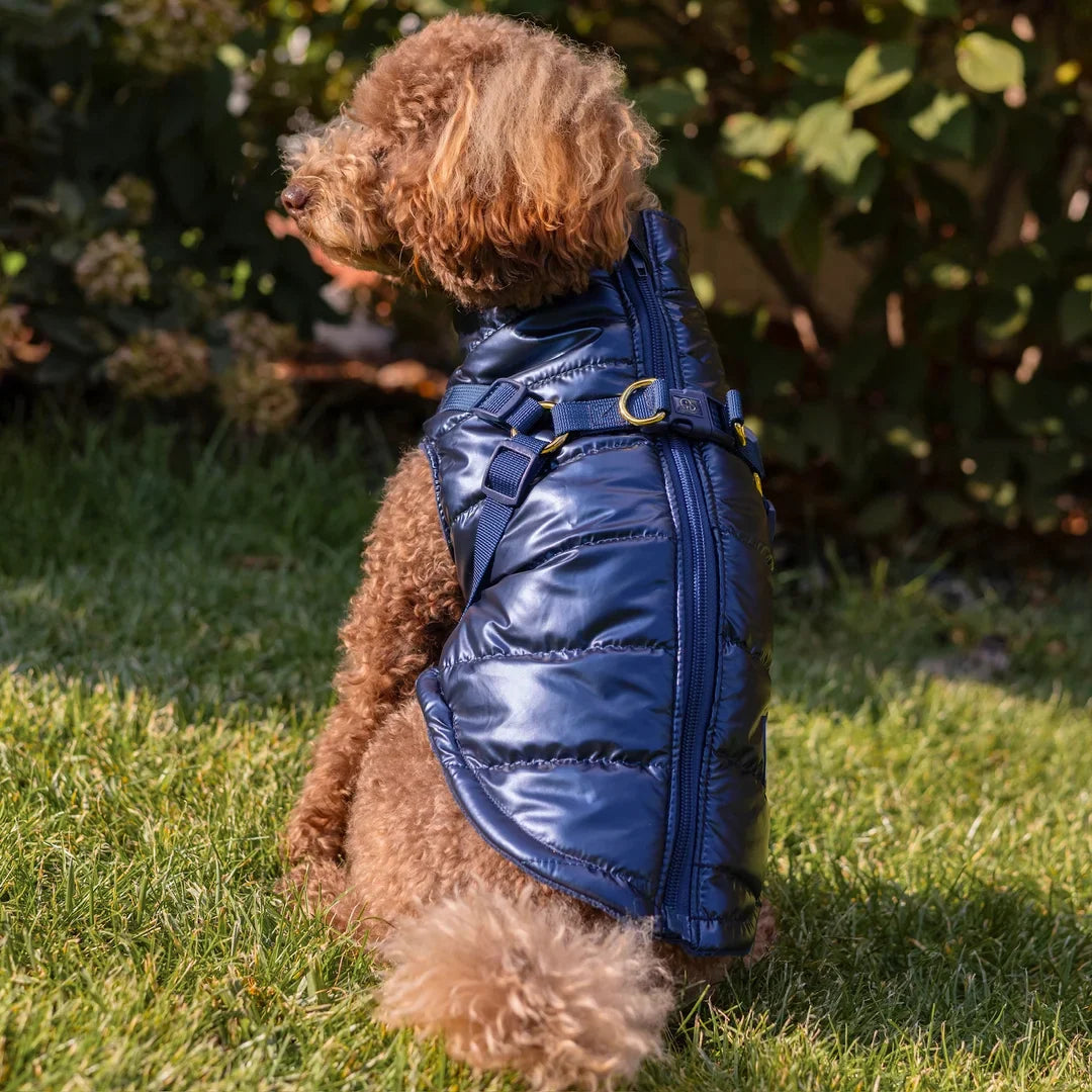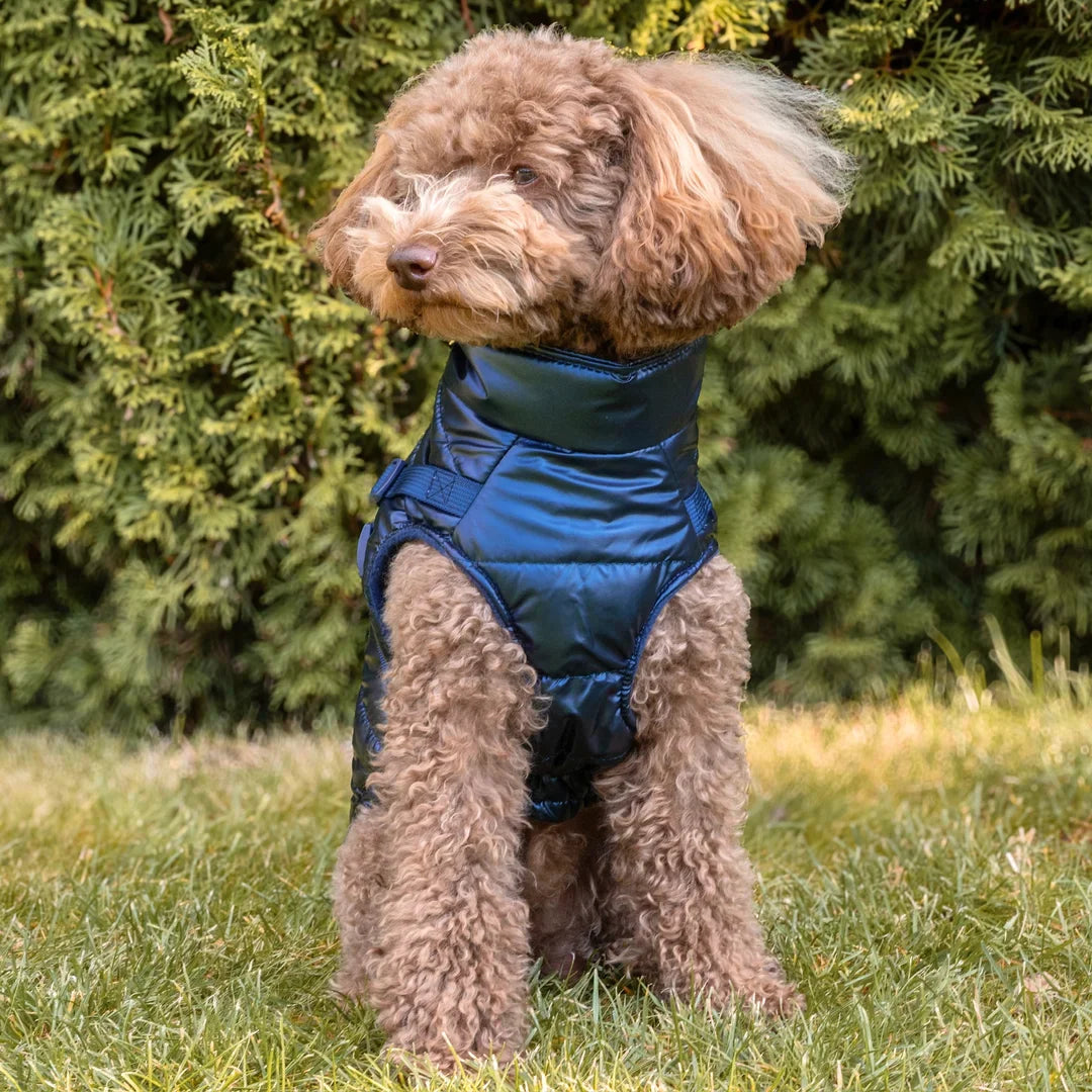 Styl i elegancja w jednym. Zimowa kurtka Pupparisian w odcieniu granatu z delikatnym połyskiem została zaprojektowana, aby zapewnić Twojemu psu komfort i ochronę w zimowe dni. To model 2w1 – kurtka z wbudowanymi szelkami, który łączy funkcjonalność i wygodę, eliminując potrzebę zakładania dodatkowych akcesoriów przed spacerem.