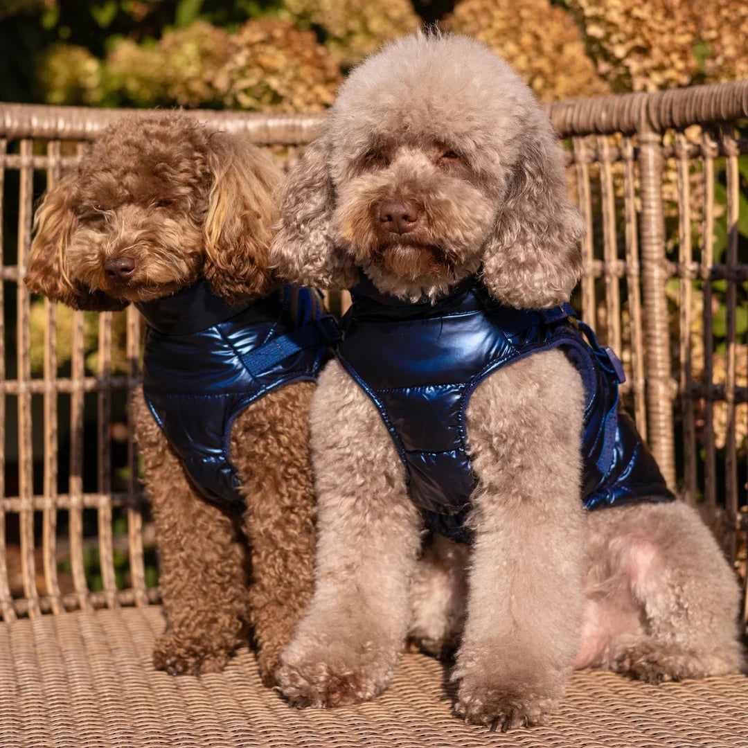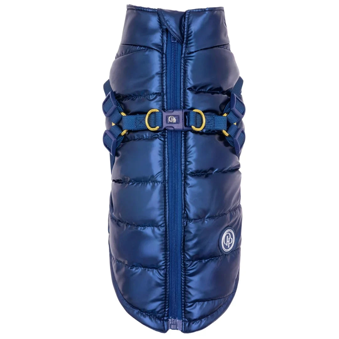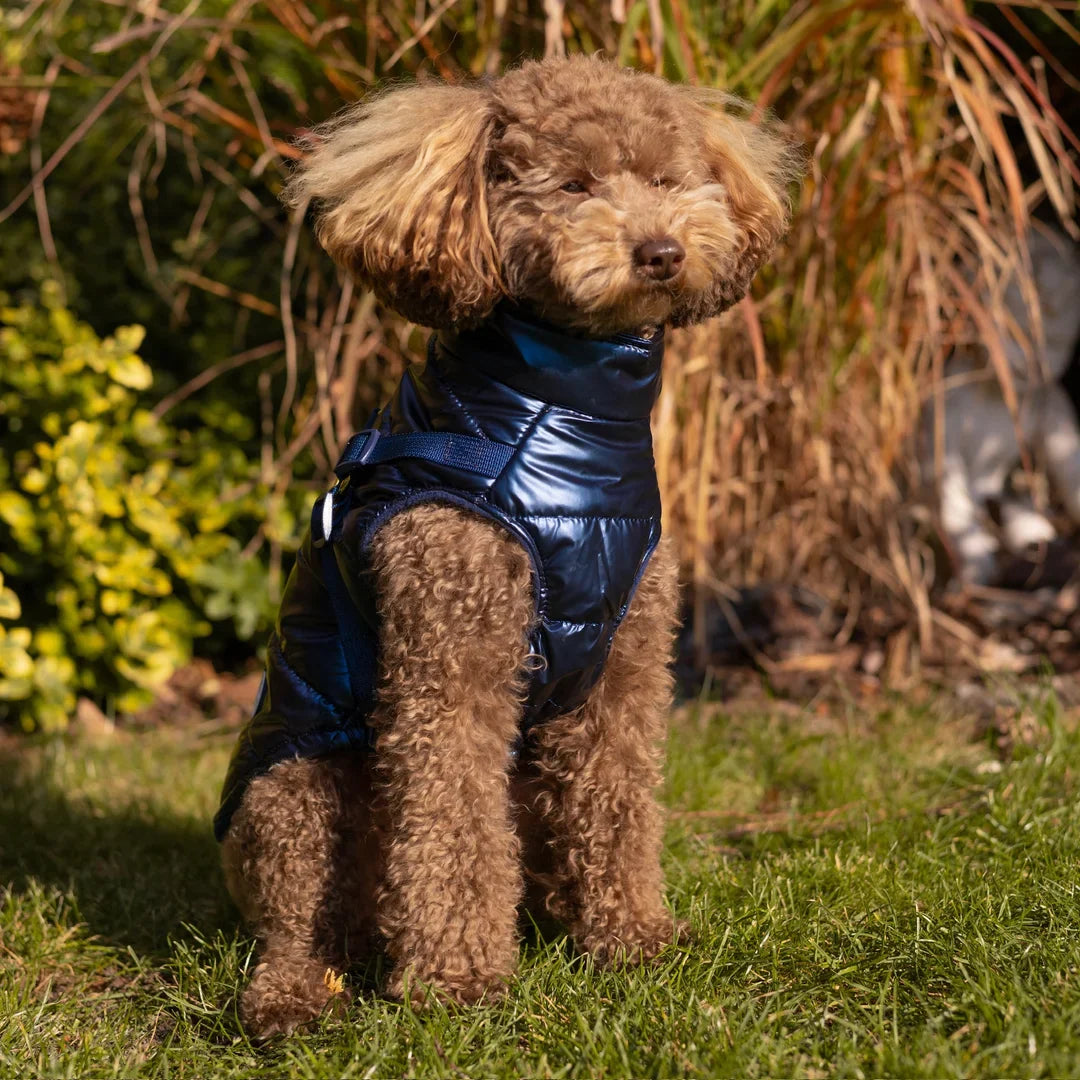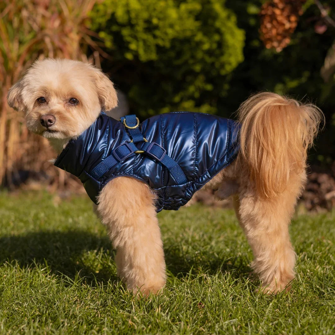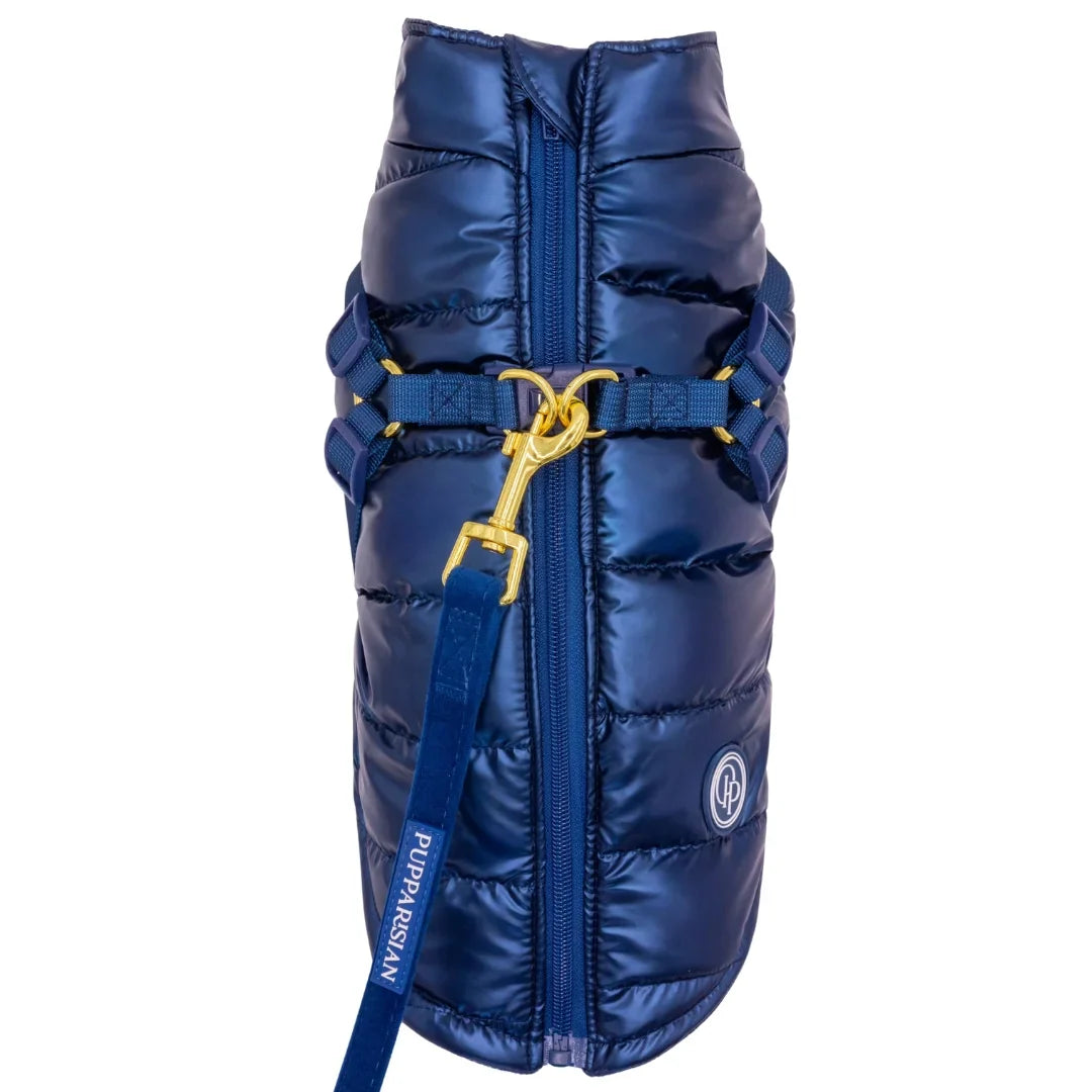 Styl i elegancja w jednym. Zimowa kurtka Pupparisian w odcieniu granatu z delikatnym połyskiem została zaprojektowana, aby zapewnić Twojemu psu komfort i ochronę w zimowe dni. To model 2w1 – kurtka z wbudowanymi szelkami, który łączy funkcjonalność i wygodę, eliminując potrzebę zakładania dodatkowych akcesoriów przed spacerem.
