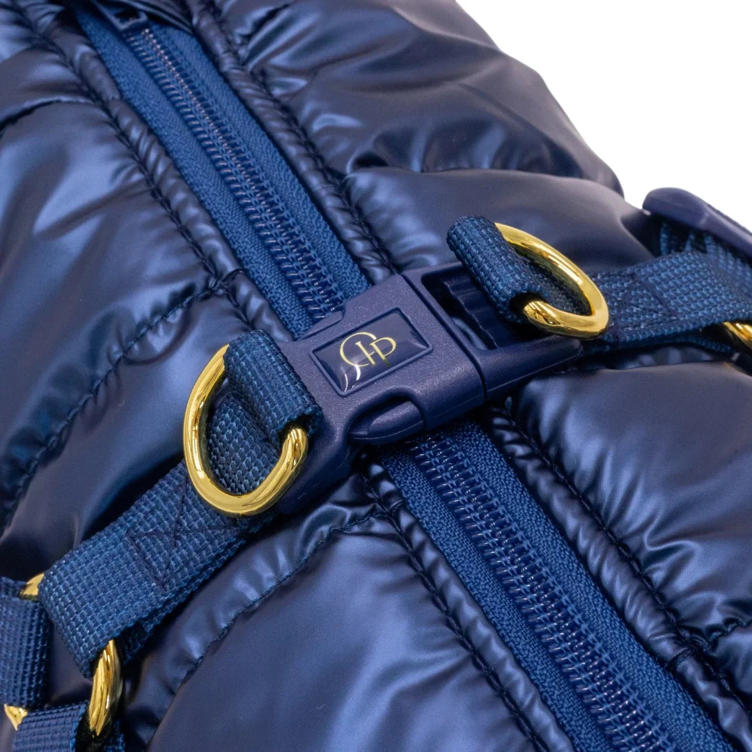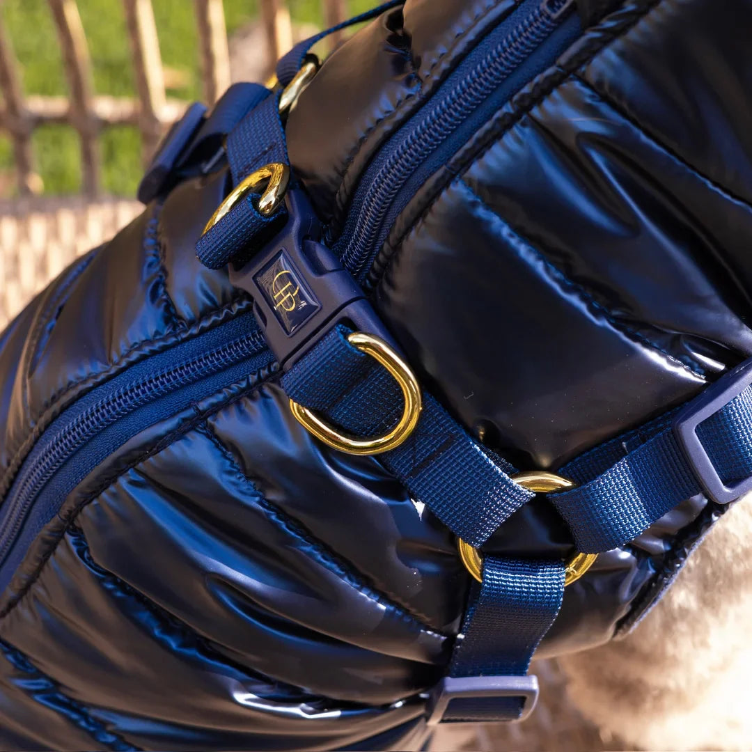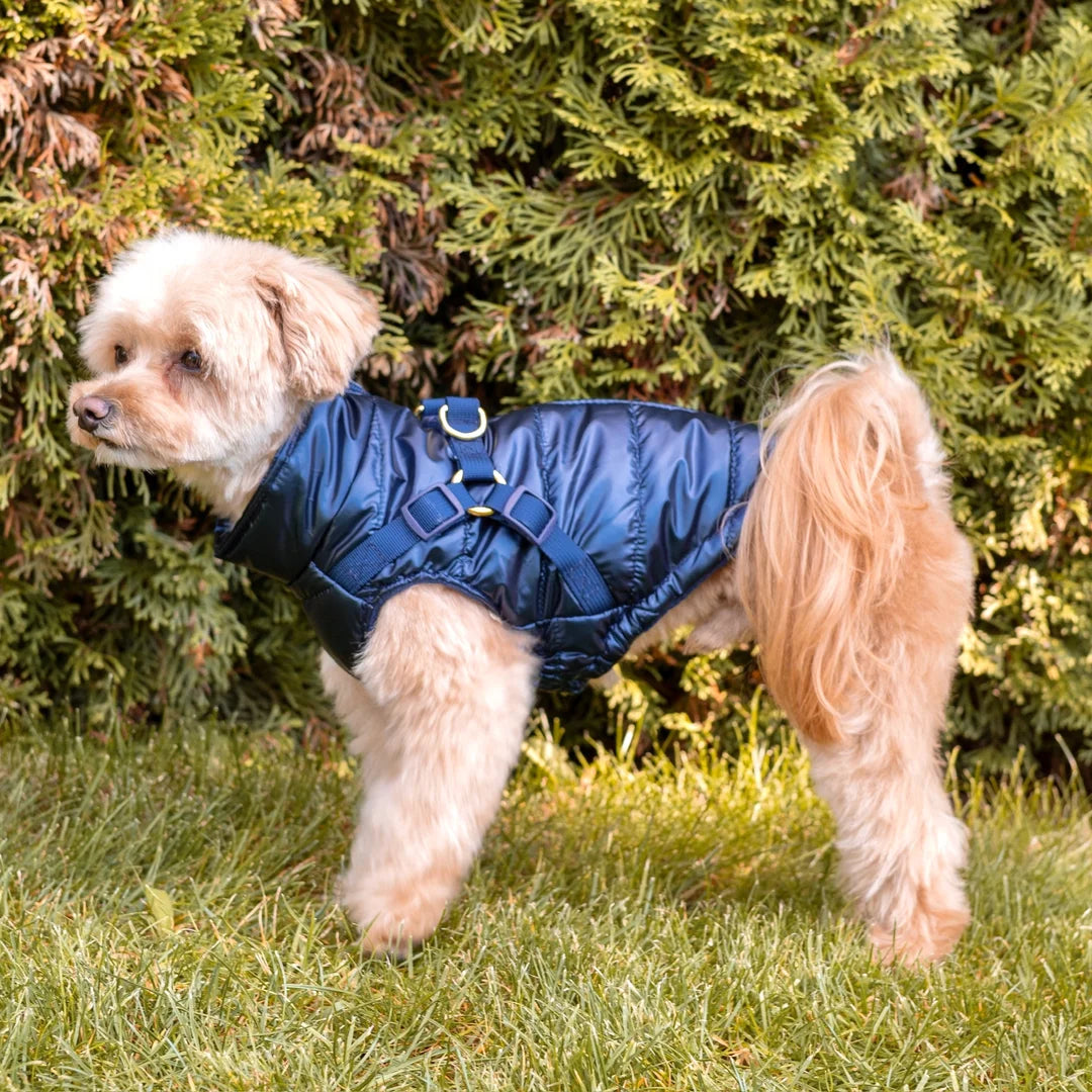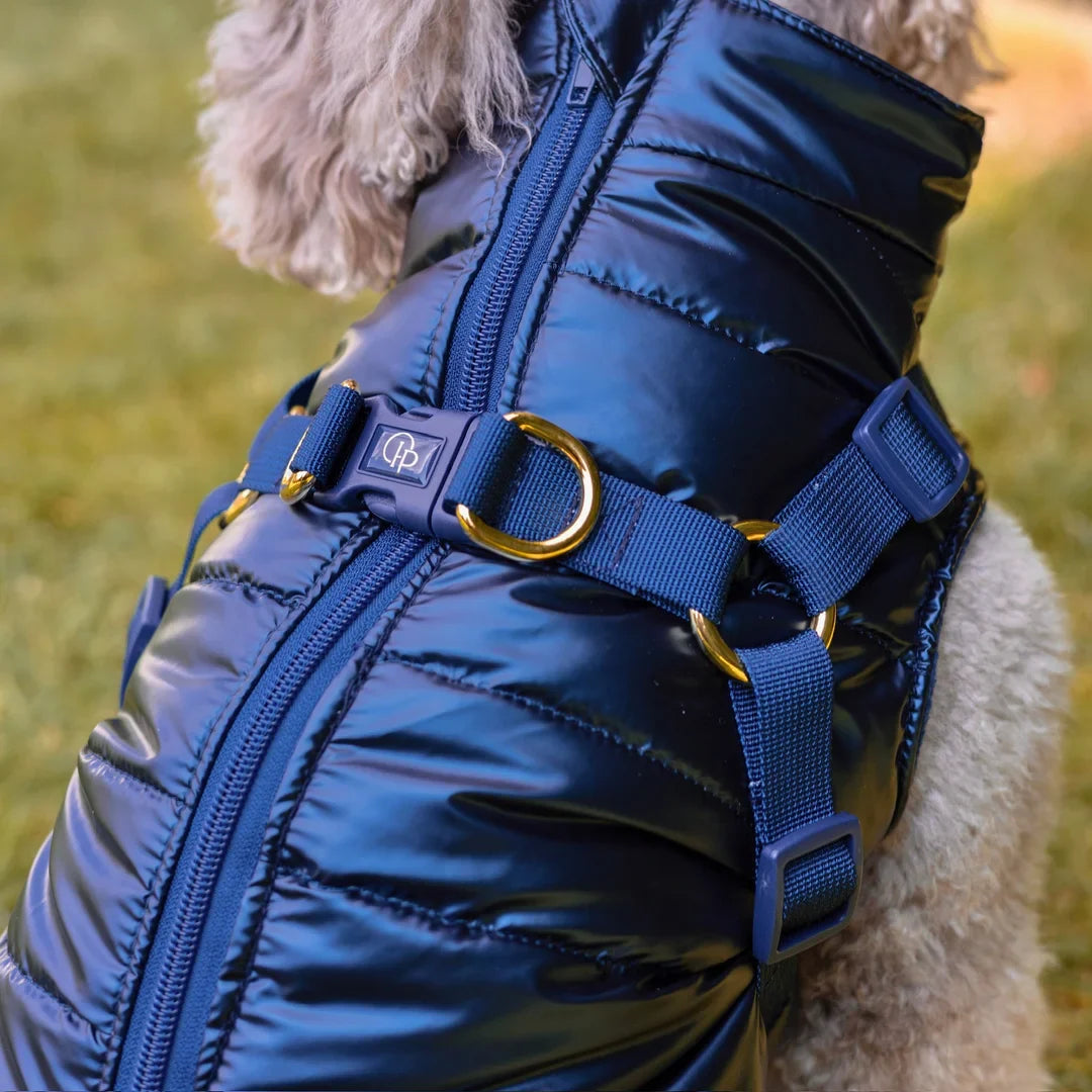Styl i elegancja w jednym. Zimowa kurtka Pupparisian w odcieniu granatu z delikatnym połyskiem została zaprojektowana, aby zapewnić Twojemu psu komfort i ochronę w zimowe dni. To model 2w1 – kurtka z wbudowanymi szelkami, który łączy funkcjonalność i wygodę, eliminując potrzebę zakładania dodatkowych akcesoriów przed spacerem.