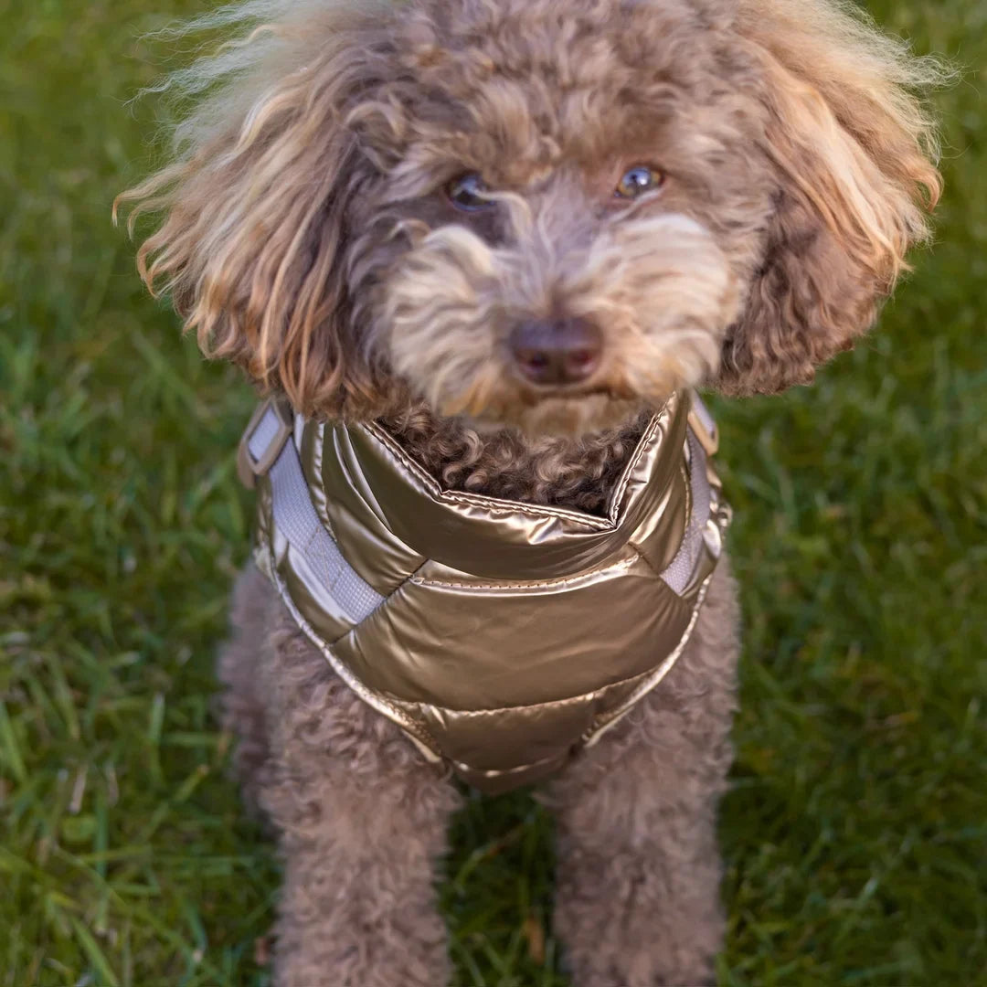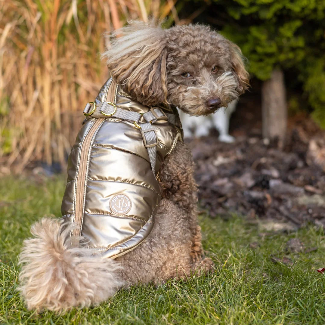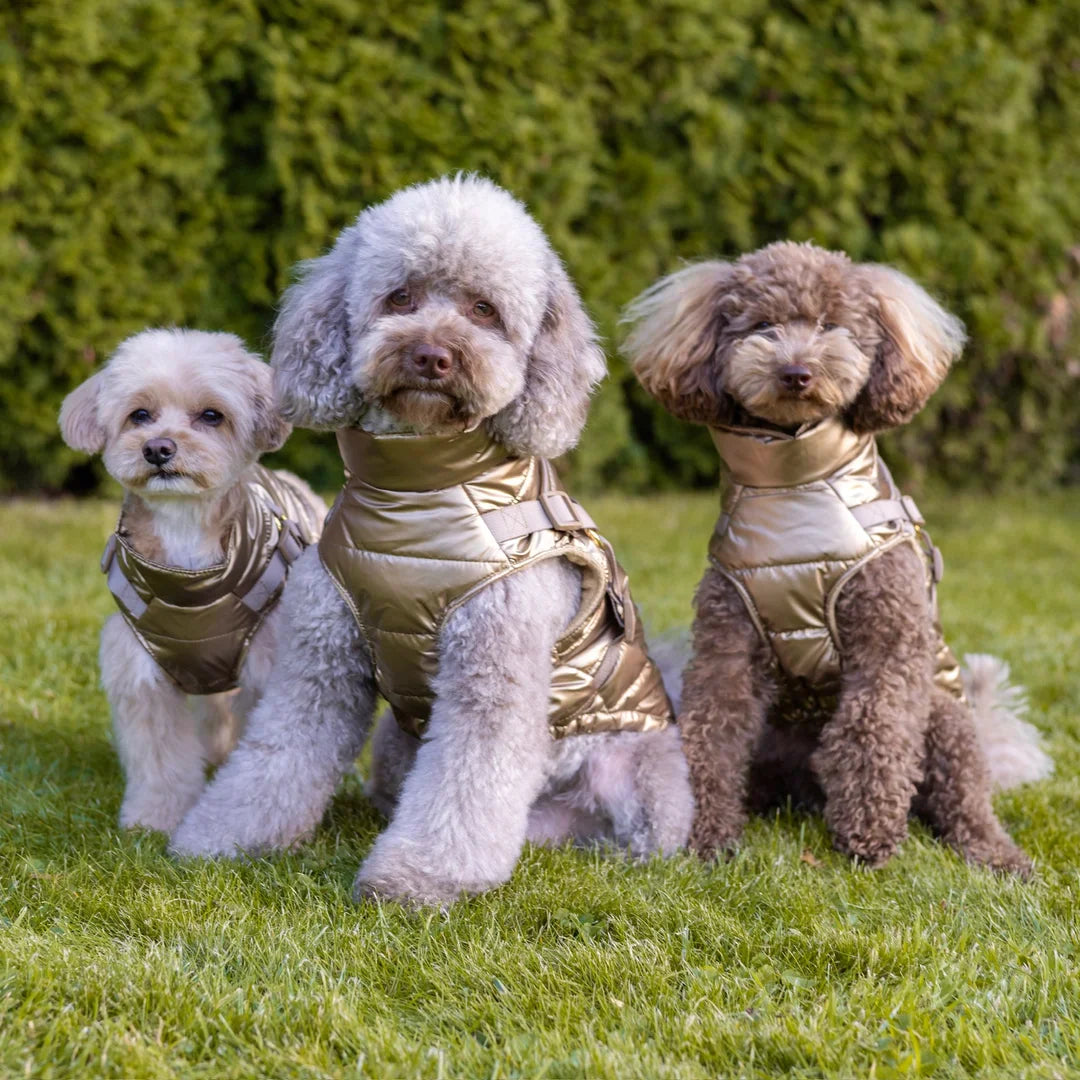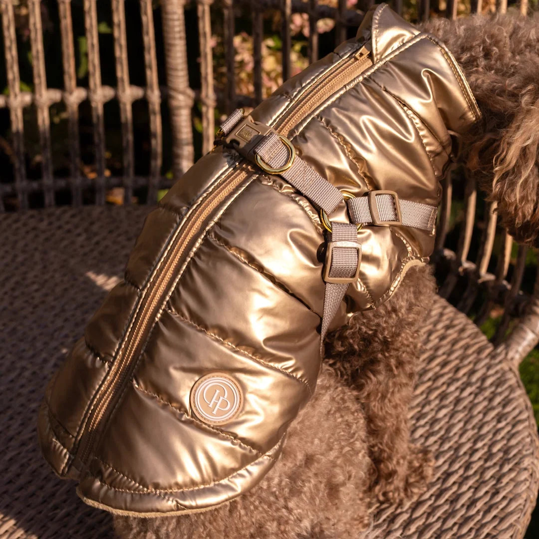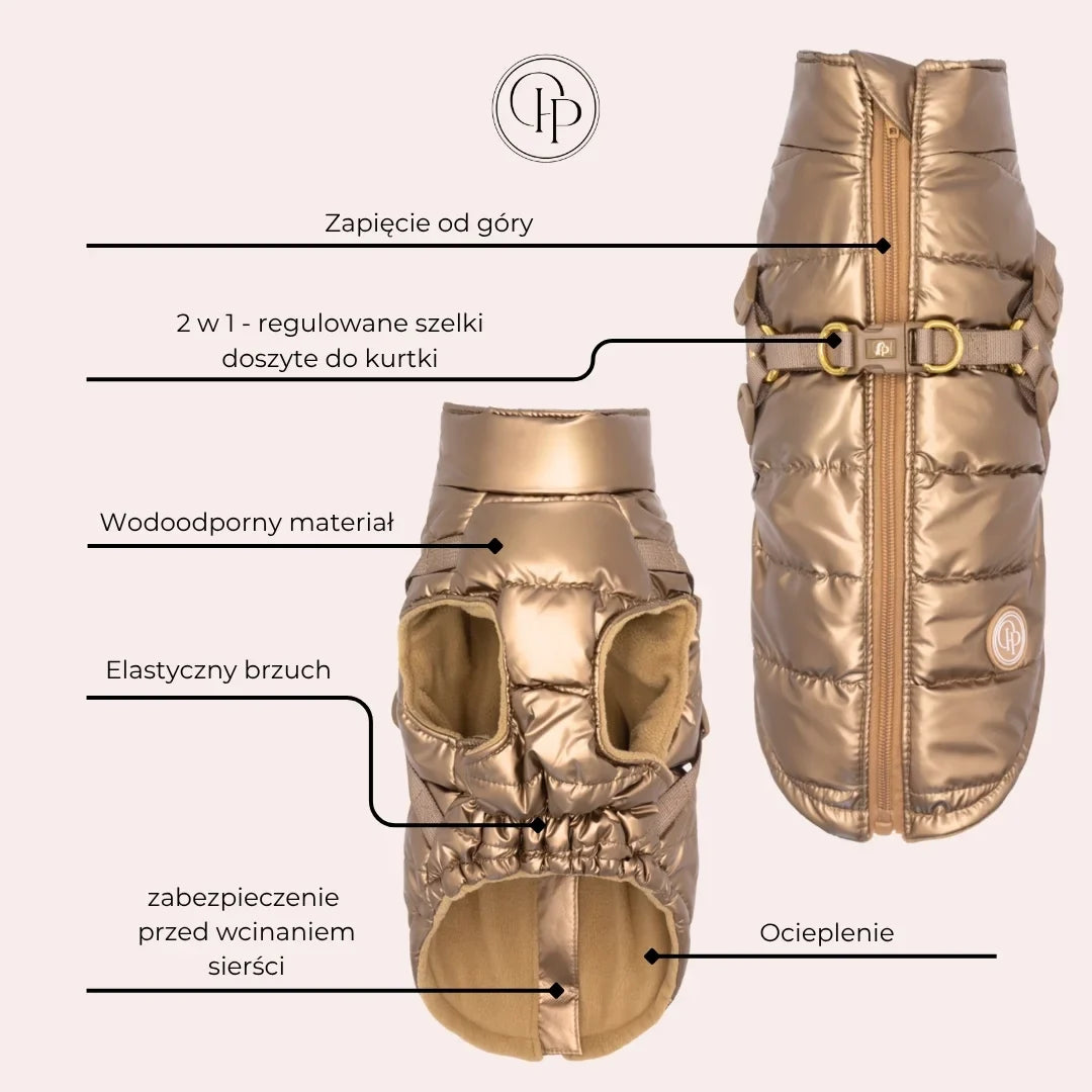 Wyjątkowy styl i luksus w jednym. Zimowa kurtka Pupparisian w odcieniu złota z eleganckim połyskiem została stworzona, aby zapewnić Twojemu psu nie tylko ochronę przed zimnem, ale także niepowtarzalny, modny wygląd. To model 2w1 – kurtka z wbudowanymi szelkami, który łączy wygodę i funkcjonalność, eliminując konieczność używania dodatkowych akcesoriów przed spacerem.