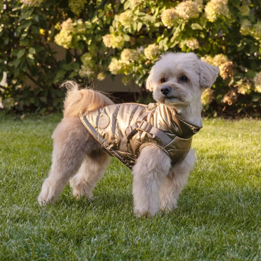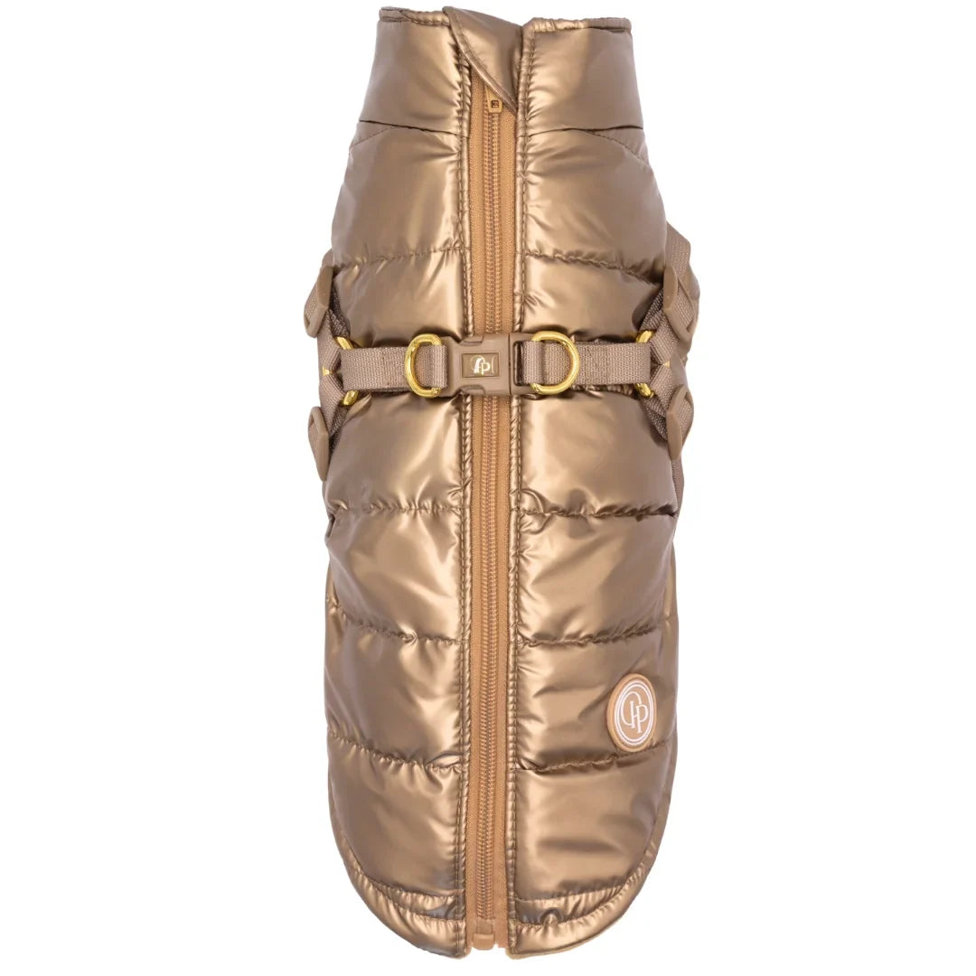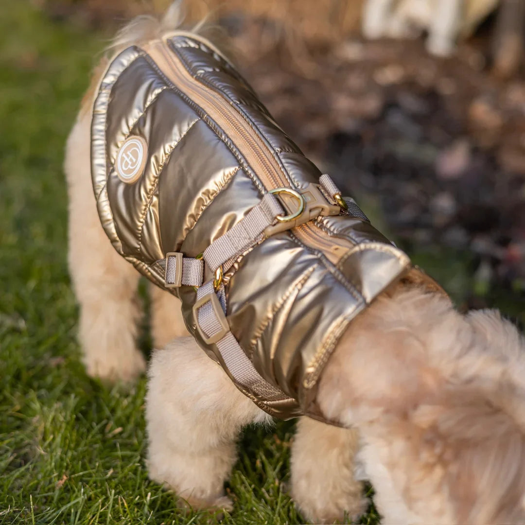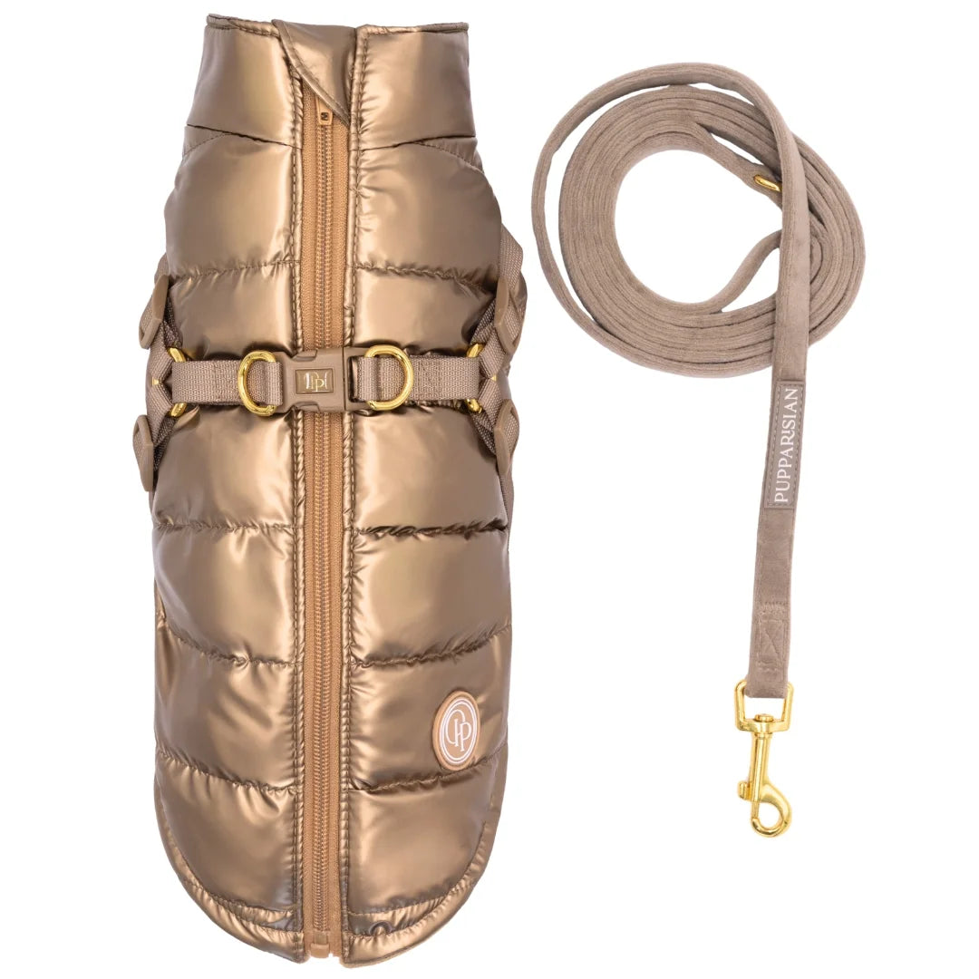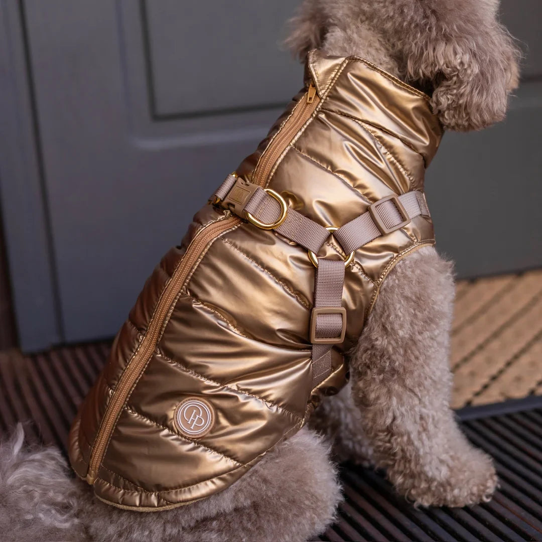 Wyjątkowy styl i luksus w jednym. Zimowa kurtka Pupparisian w odcieniu złota z eleganckim połyskiem została stworzona, aby zapewnić Twojemu psu nie tylko ochronę przed zimnem, ale także niepowtarzalny, modny wygląd. To model 2w1 – kurtka z wbudowanymi szelkami, który łączy wygodę i funkcjonalność, eliminując konieczność używania dodatkowych akcesoriów przed spacerem.