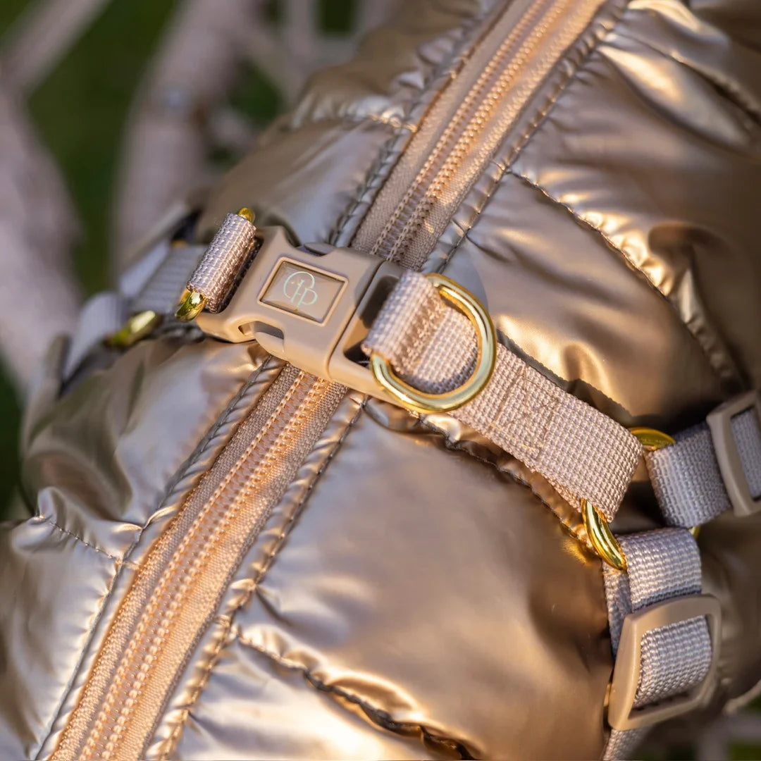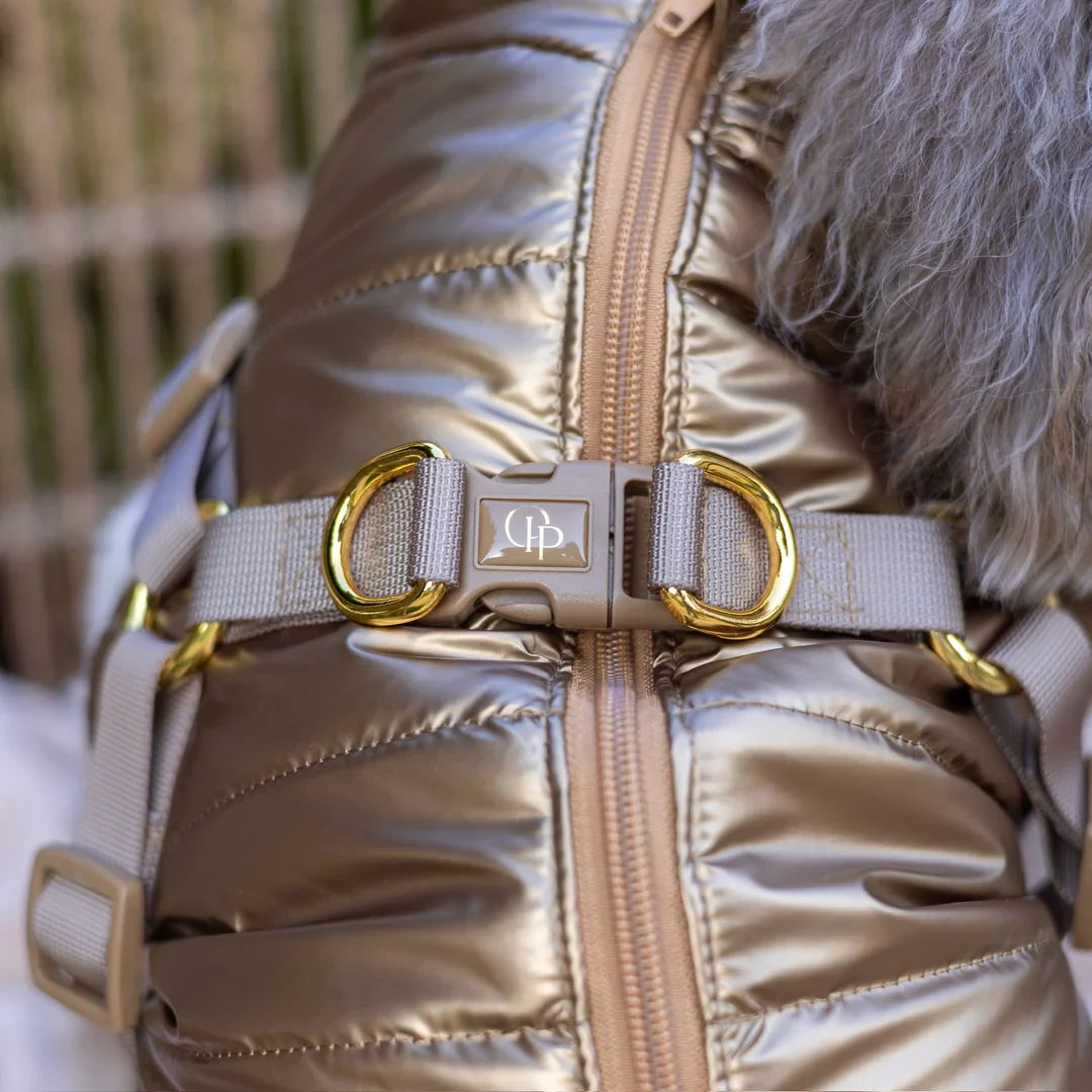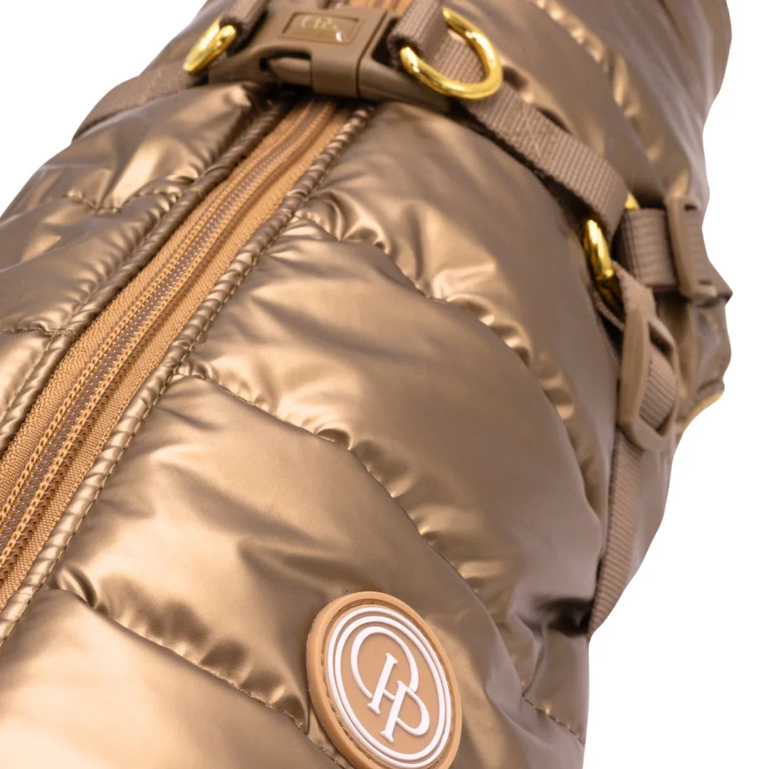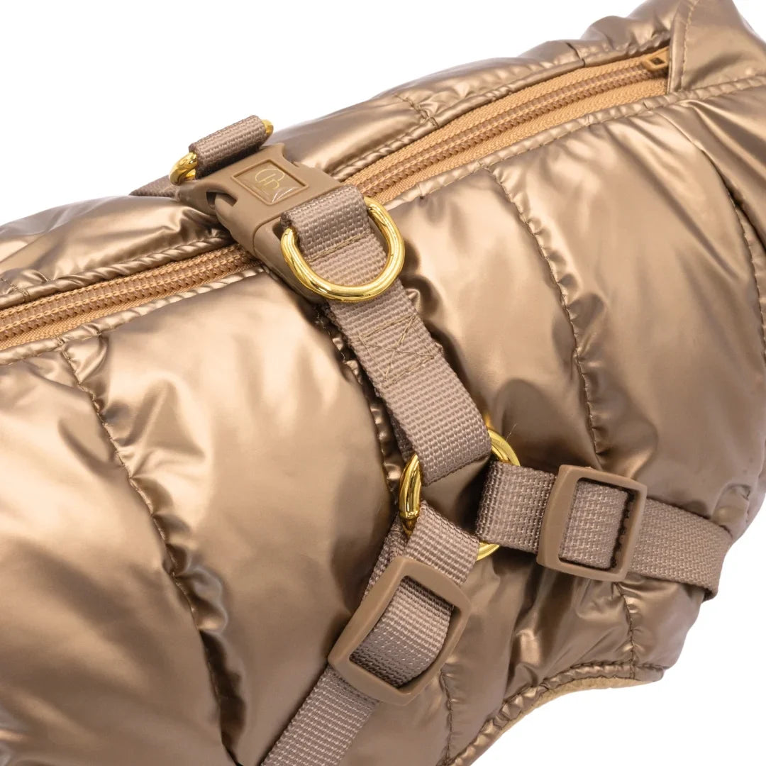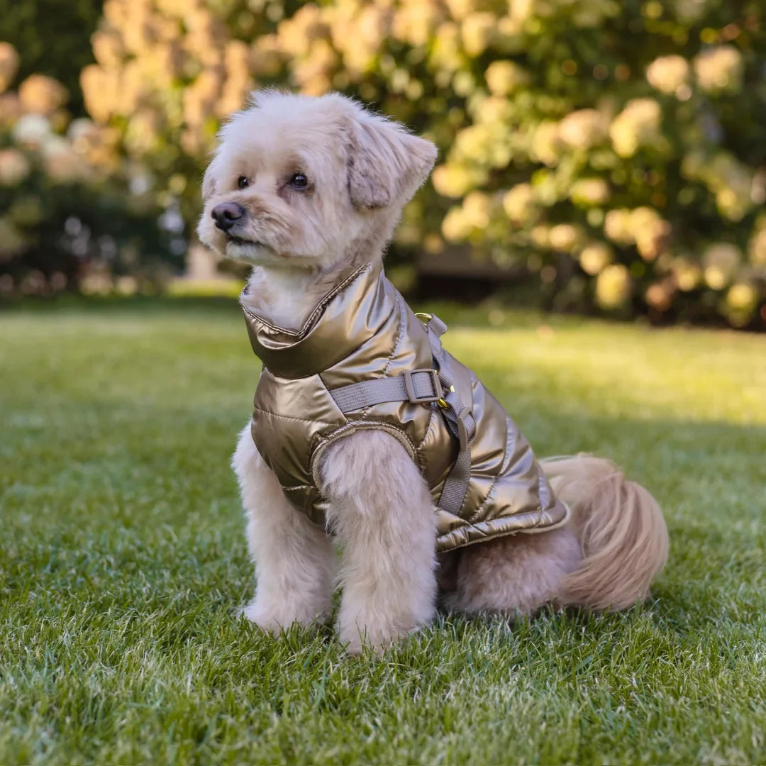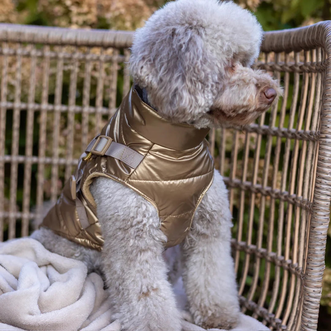 Wyjątkowy styl i luksus w jednym. Zimowa kurtka Pupparisian w odcieniu złota z eleganckim połyskiem została stworzona, aby zapewnić Twojemu psu nie tylko ochronę przed zimnem, ale także niepowtarzalny, modny wygląd. To model 2w1 – kurtka z wbudowanymi szelkami, który łączy wygodę i funkcjonalność, eliminując konieczność używania dodatkowych akcesoriów przed spacerem.