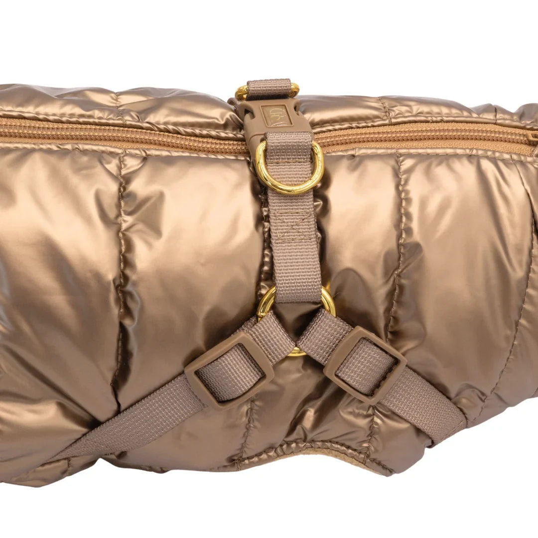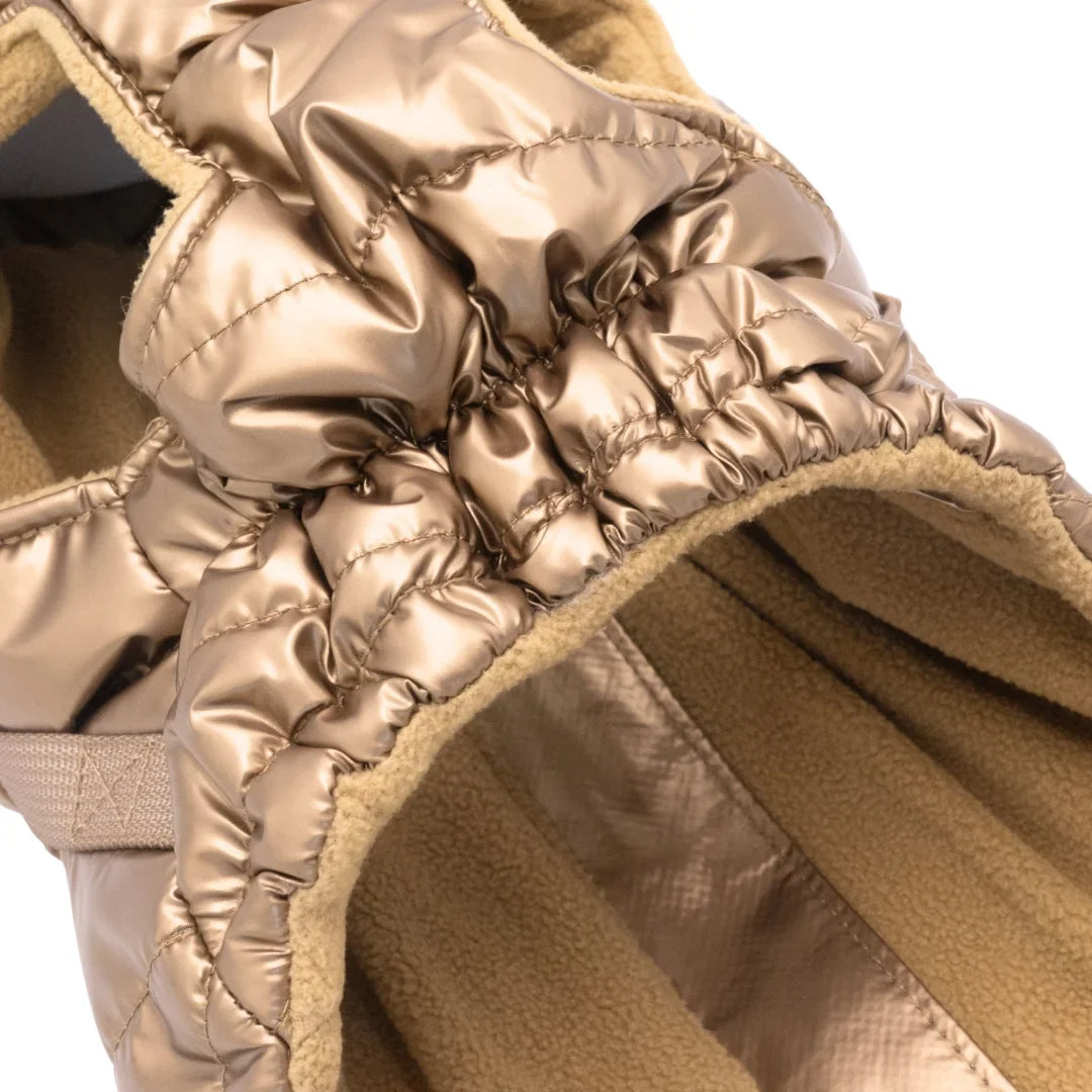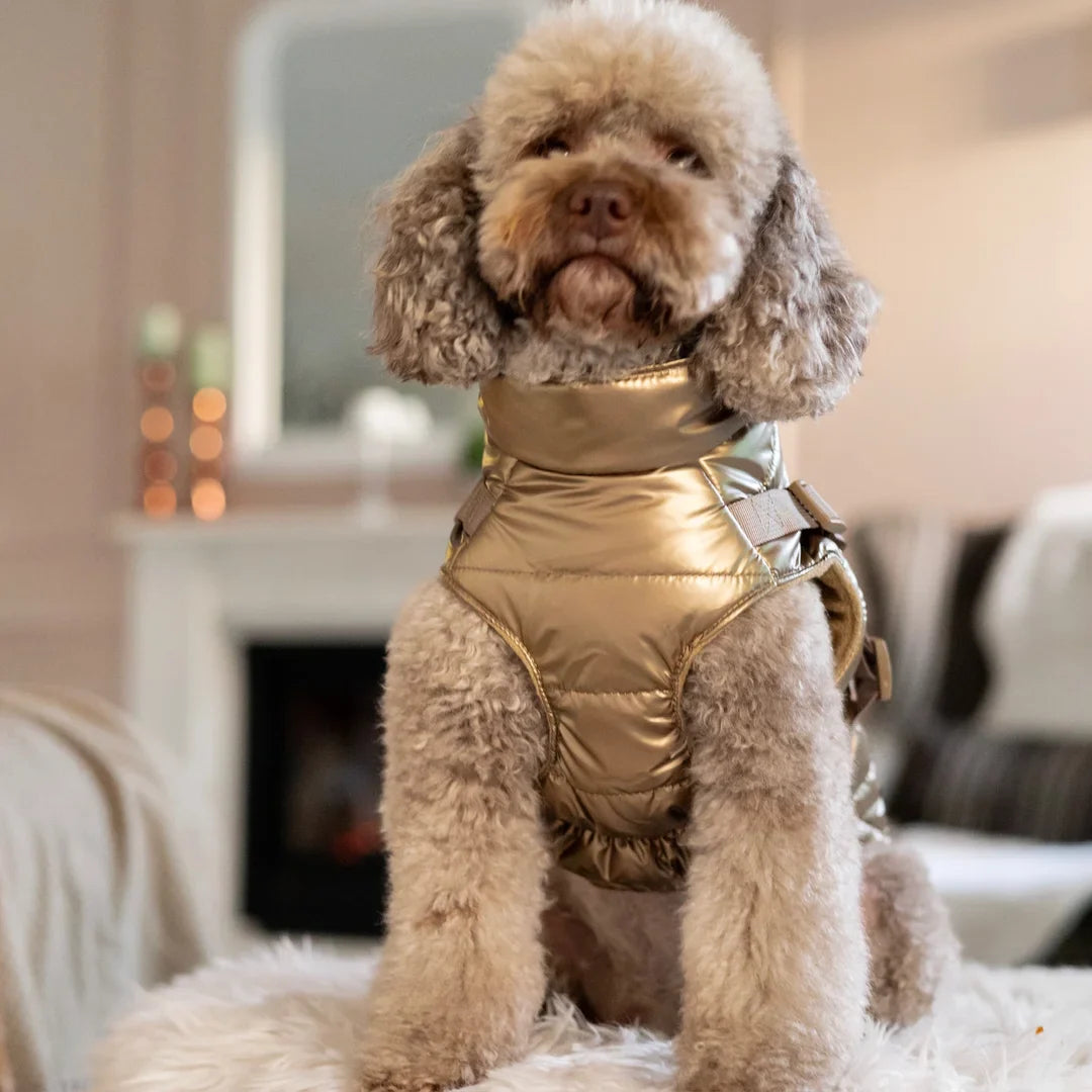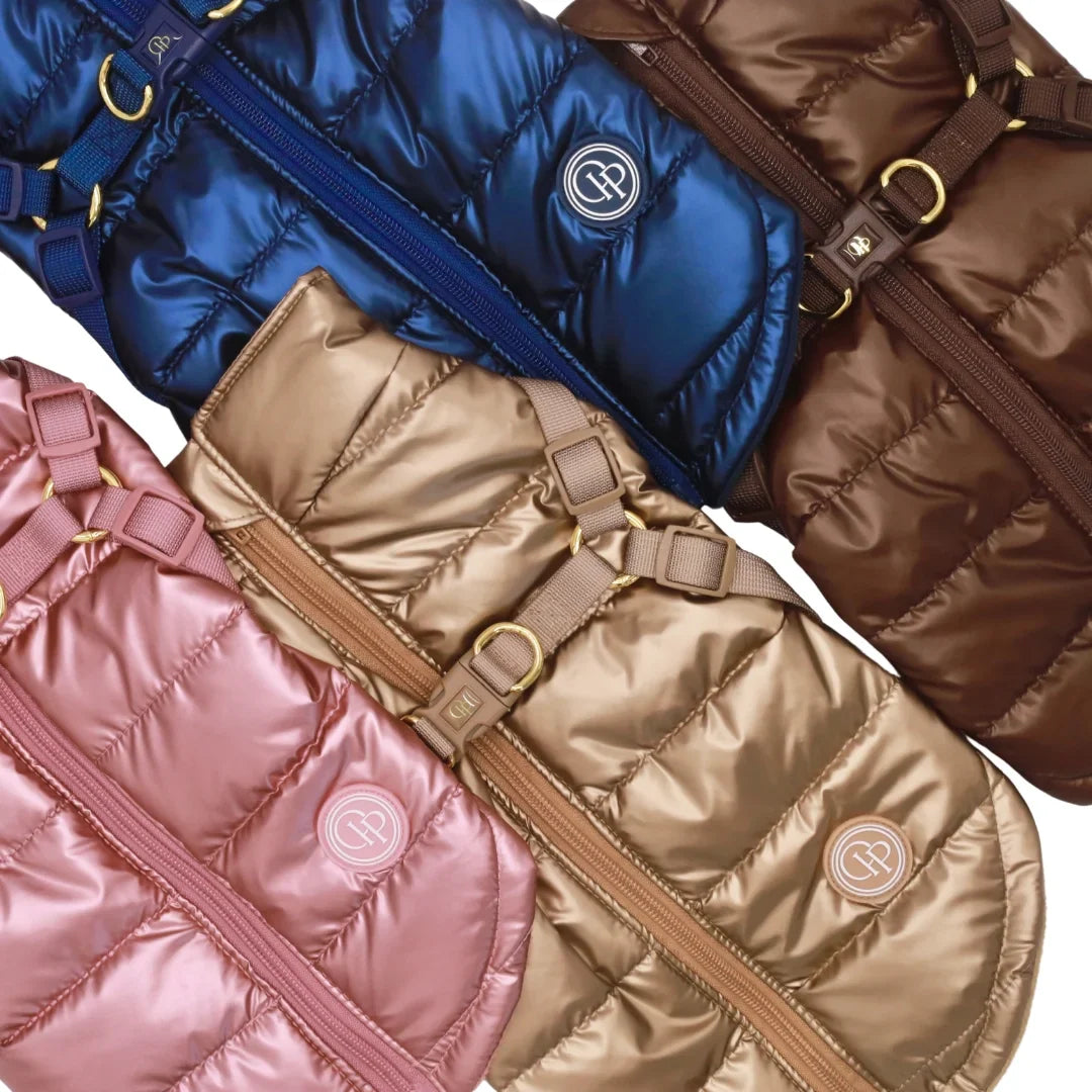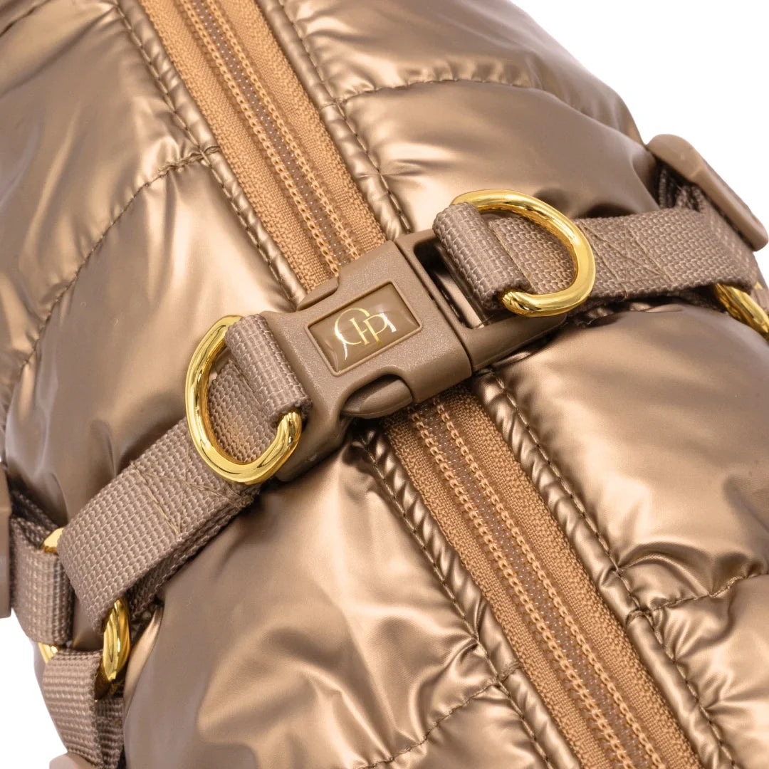 Wyjątkowy styl i luksus w jednym. Zimowa kurtka Pupparisian w odcieniu złota z eleganckim połyskiem została stworzona, aby zapewnić Twojemu psu nie tylko ochronę przed zimnem, ale także niepowtarzalny, modny wygląd. To model 2w1 – kurtka z wbudowanymi szelkami, który łączy wygodę i funkcjonalność, eliminując konieczność używania dodatkowych akcesoriów przed spacerem.