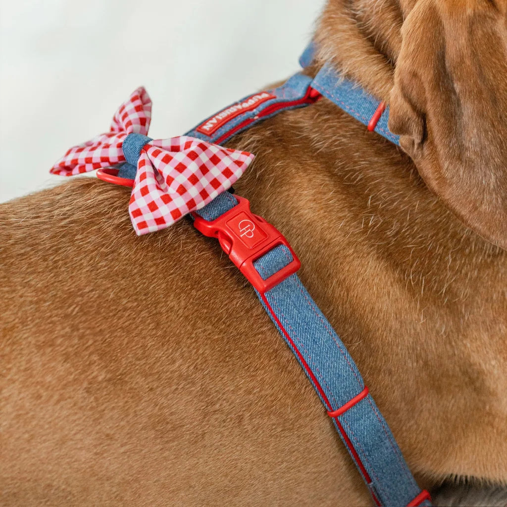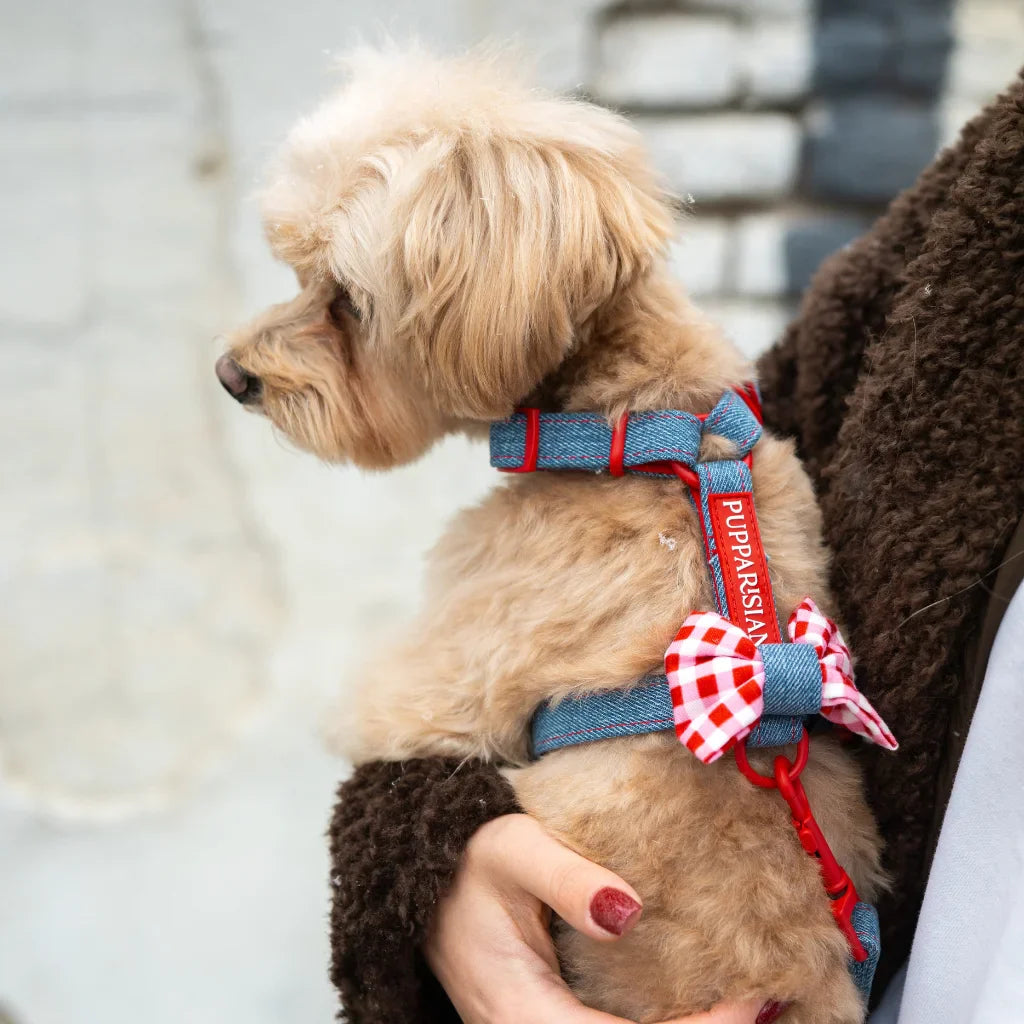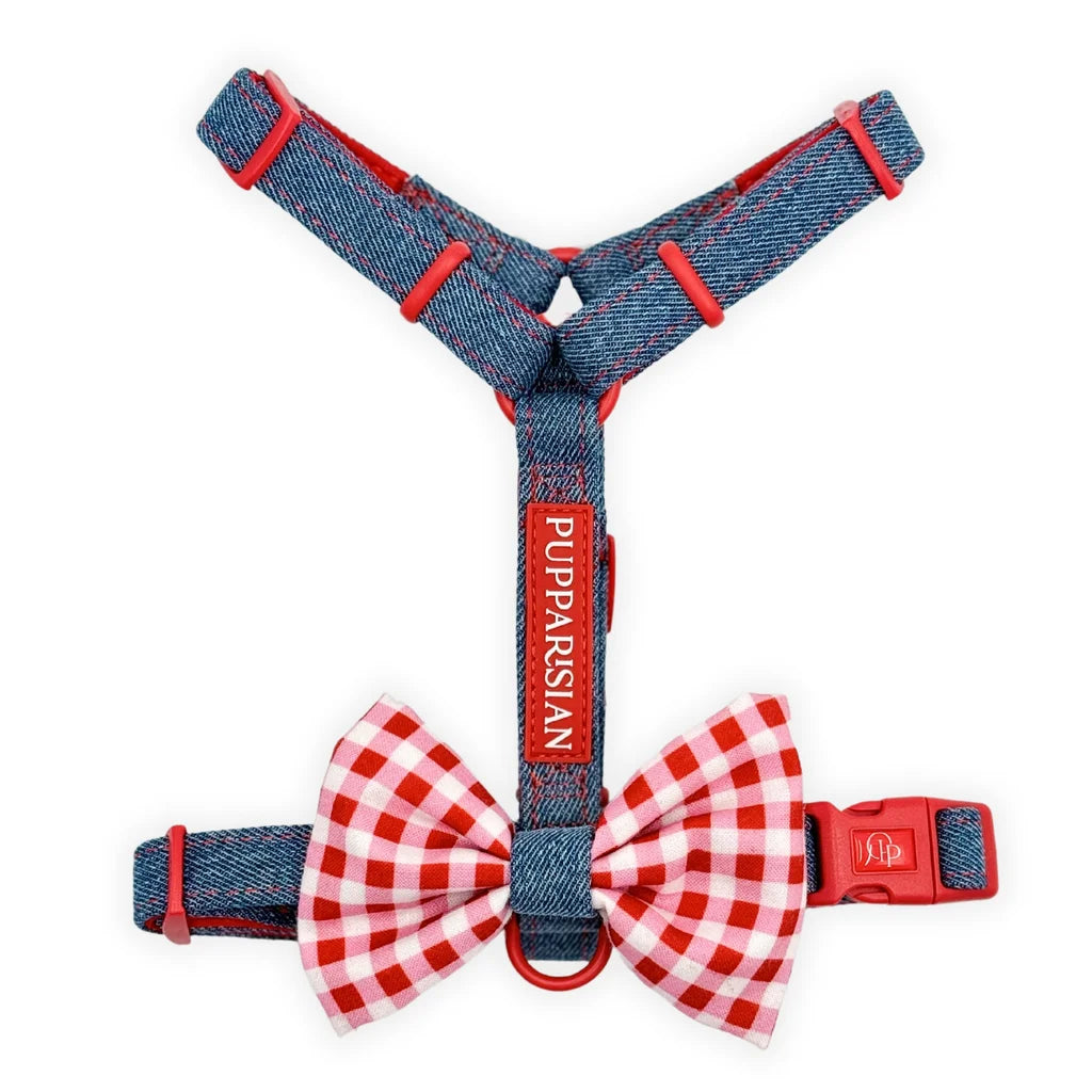 Bestsellerový postroj typu guard s mašlí od Pupparisian je nyní k dispozici i v jeansové verzi. Dopřejte svému mazlíčkovi pohodlný a stylový outfit na každodenní procházky. Postroj z kolekce Funky odpovídá nejnovějším trendům – klasický denim je oživen červenými detaily, které dodávají výjimečný charakter. Mašle v bílo-červené kostce přidává nezaměnitelné kouzlo a díky suchým zipům ji lze snadno odepnout nebo připnout jiným způsobem.
