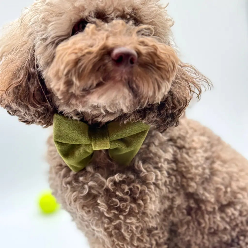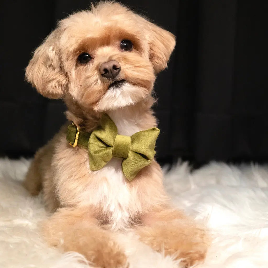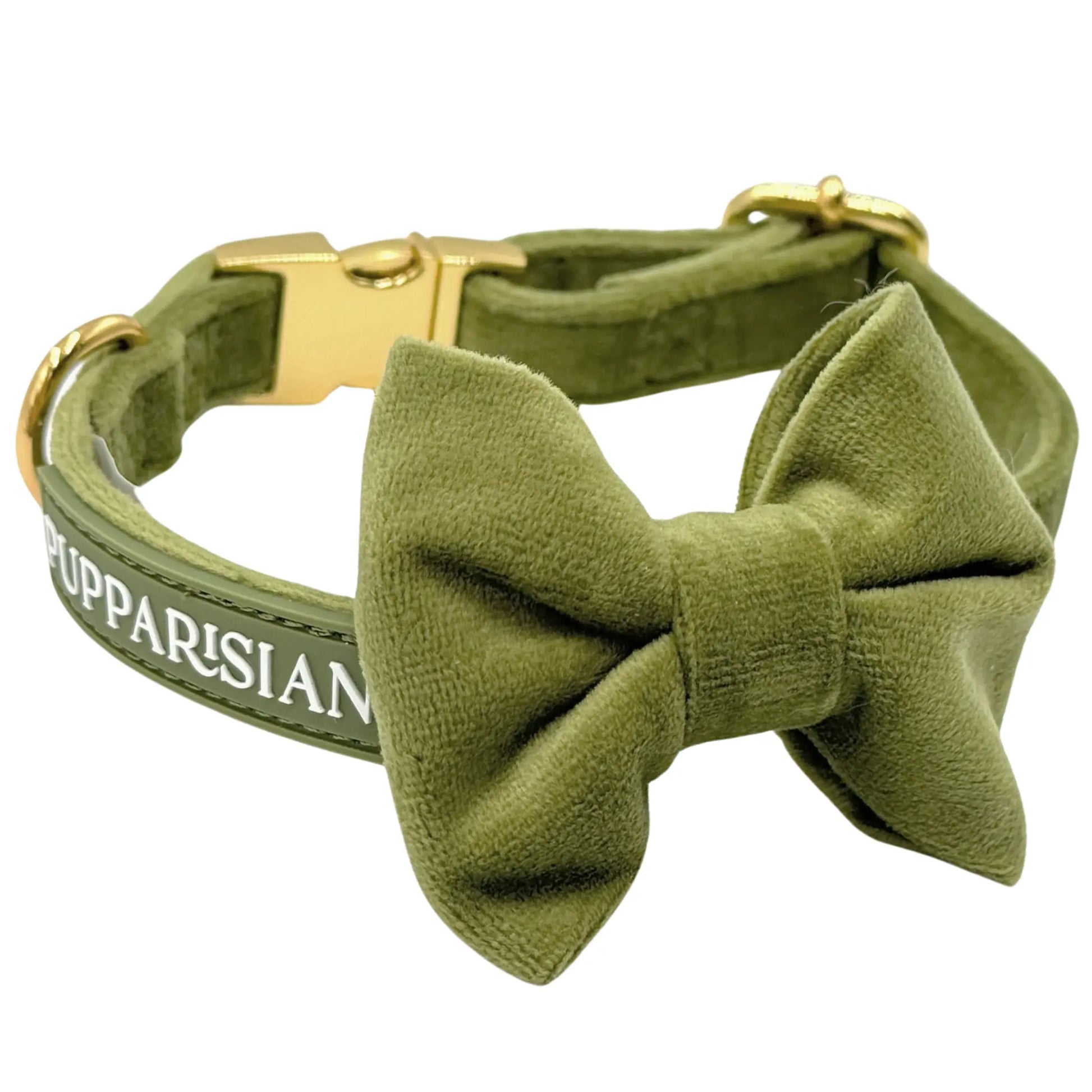 Sametový obojek s motýlkem pro psa – olivově zelený