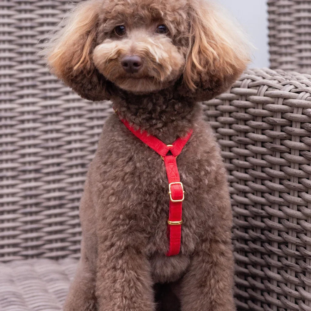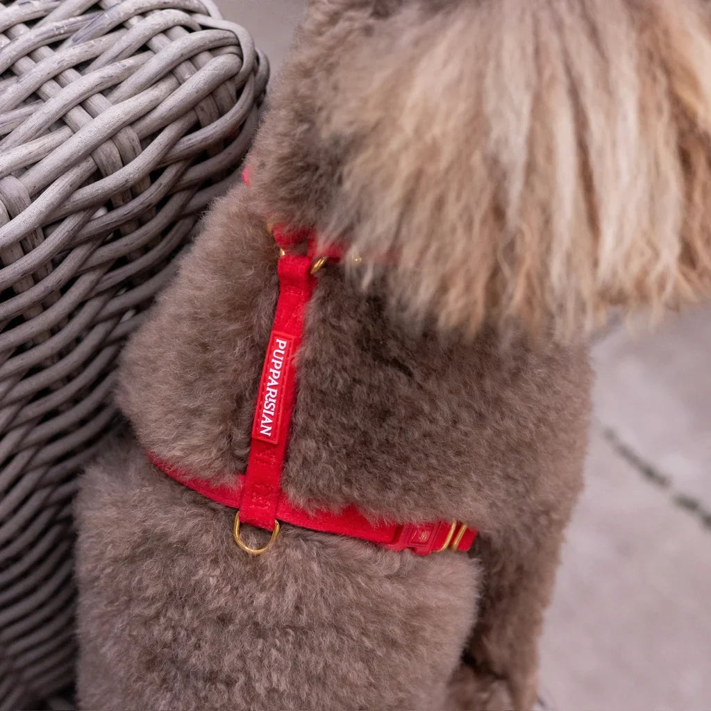 Sametový postroj typu guard od značky Pupparisian v intenzivním, sytém odstínu červené spojuje eleganci a funkčnost, a je navržený s ohledem na pohodlí a bezpečnost vašeho mazlíčka. Vyrobený z měkkého, luxusního sametu je příjemný na dotek, nezpůsobuje odřeniny a neomezuje volnost pohybu – ani při delších procházkách.